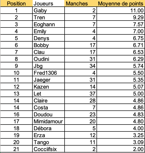 Rappel : seuls les joueurs qui ont effectué 1/3 du total des manches jouées (37 cette saison, donc 12 manches) sont éligibles à la qualificiation pour le CNIC 2019