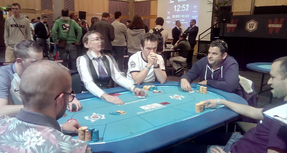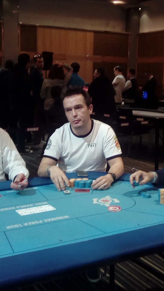 Pour ma part le side s’est déroulé comme dans un rêve. Je suis monté rapidement à 8.000 jetons en rentabilisant un peu JJ, QQ puis en volant avec 2-5s sur un board A4J… Un mauvais move m’a fait retomber à 3.500 juste avant le repas de midi. Tout était à refaire. De retour à table en BB au niveau 300-600+50, UTG1 part à tapis pour 3800, payé par SB. Je trouve A5 off. Je réfléchis un moment avant de me dire que j’ai 2900 à investir dans un pot de 7200. Mon kicker me gêne un peu, mais avec 6 blinds je call. UTG1 ouvre QK, SB a A4. Je suis surpris d’avoir la meilleure main. En plus, l’apparition d’un 2 et d’un 3 m’évite de devoir partager. Je remonte alors la pente. Un tapis payé avec les 3 me permet de remonter à 12.000. Puis un hero-call avec AJs sur un board K28Q7 me permet de gagner encore quelques jetons après le muck de mon adversaire. De fil en aiguille je suis monté à 42k sans trop souffrir. A 32 left pour 27 payants, les joueurs à table commençaient à parler un peu des places payées. J’ai alors réalisé que je n’étais qu’à 5 places du ticket à 50€ sur Winamax. Un joueur a relancé de nombreuses fois préflop, faisant considérablement gonfler son tapis sans trouver de résistance. J’apprenais la patience. Puis il a payé 2 tapis avec 88 vs JJ puis QQ vs KK pour bien redescendre. Finalement la bulle a éclaté et une autre dynamique s’est installée. Les shorts ont poussé pour doubler. Je n’avais toujours pas de jeu mais restait au-dessus du tapis moyen. A la bulle de la TF, je suis en SB et le bouton fait tapis (il me couvre de de peu). Je regarde mon jeu et je découvre une magnifique paire QQ. Je fais mine d’hésiter un moment en espérant pouvoir attirer aussi le BB. Finalement nous restons 2 dans le coup : 67s vs QQ. J’ai transpiré un peu sur le flop 10-8-3 offrant un tirage ventral à mon adversaire mais finalement ce coup m’a permis d’accéder à la TF avec 104.000 jetons. La bulle a éclaté en même temps sur la 2ème table… Je suis 3ème en jetons, avec 104k pour un average à 74k. 3 tickets pour le 550€ de Dublin, je me dis que c’est largement jouable. Le joueur à ma droite (le coq sportif sur la photo) est chipleader et a déjà gagné son ticket l’année dernière pour Dublin sur le Main-Event, c’est le joueur que je prends le plus au sérieux avec David le docker du Havre qui pose à ses côtés. On a bien sympathisé avec David et son binôme la veille sur la péniche et il est deuxième en jetons.