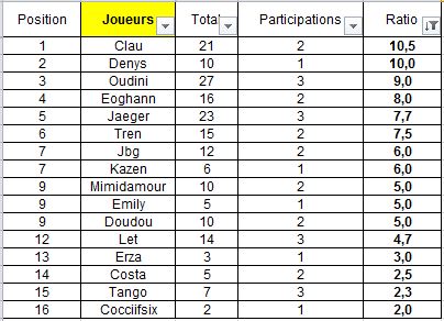 Place	Joueurs	        Total	   Participations	   Ratio